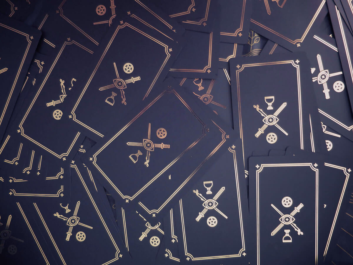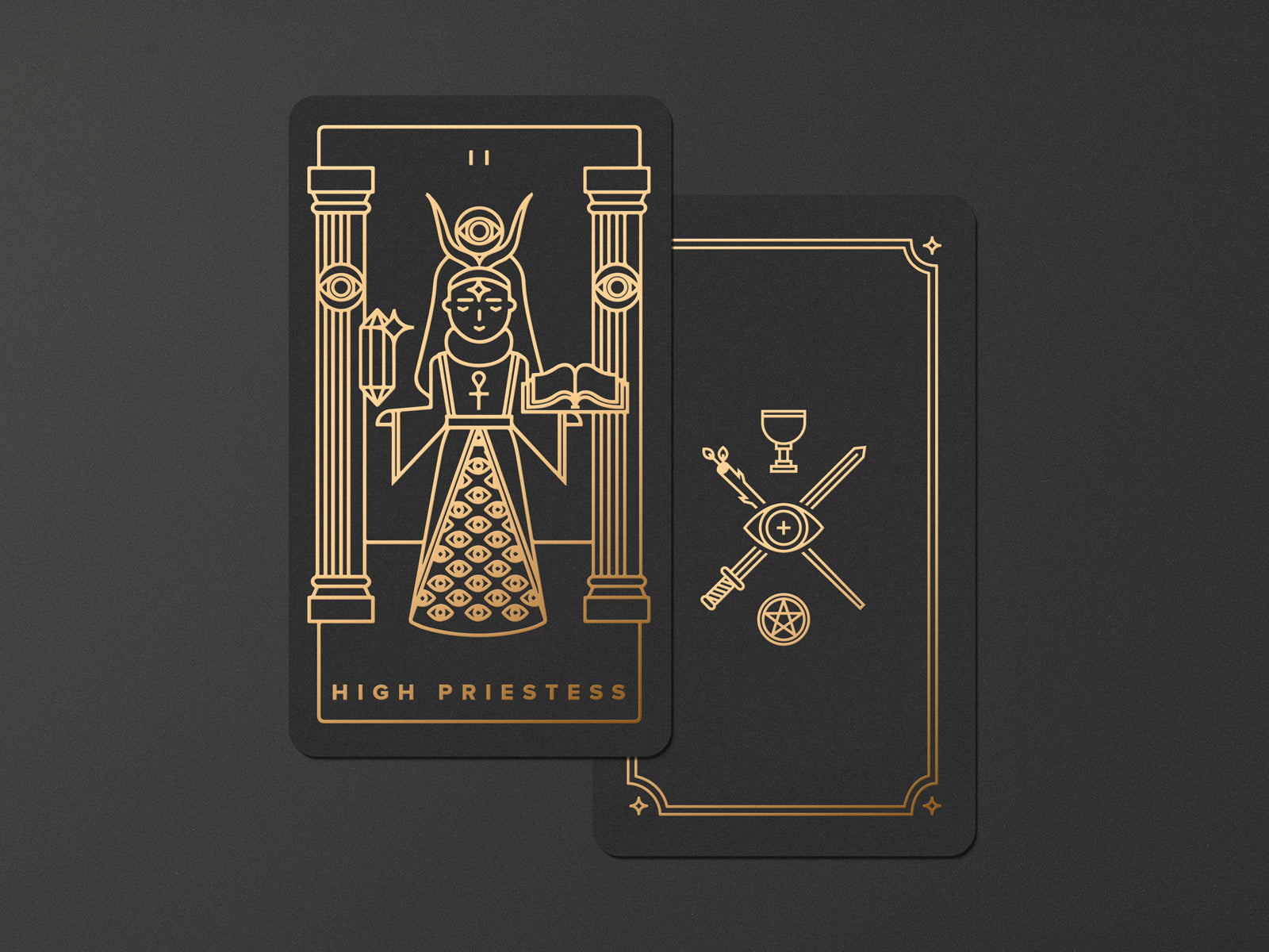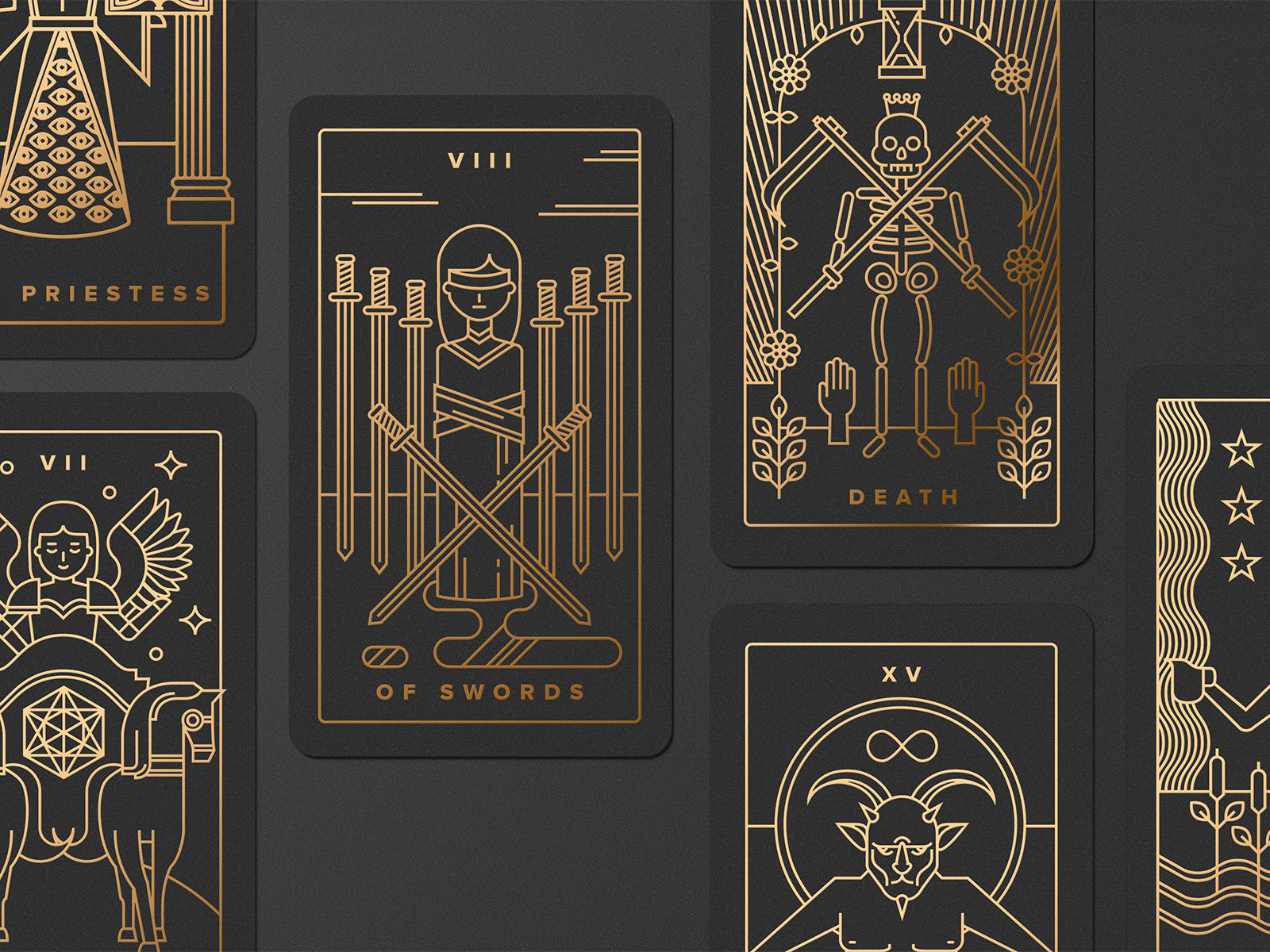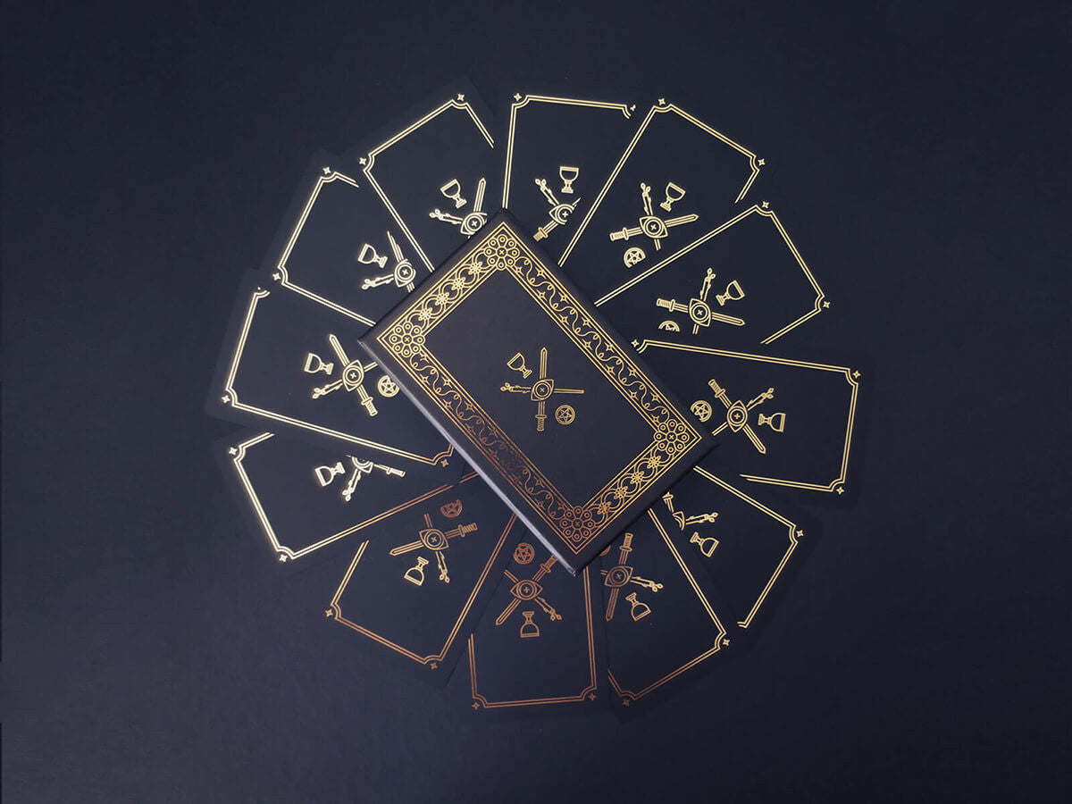 A minimalist iconographic tarot card deck printed with gold foil on sleek, matte, recycled plastic.