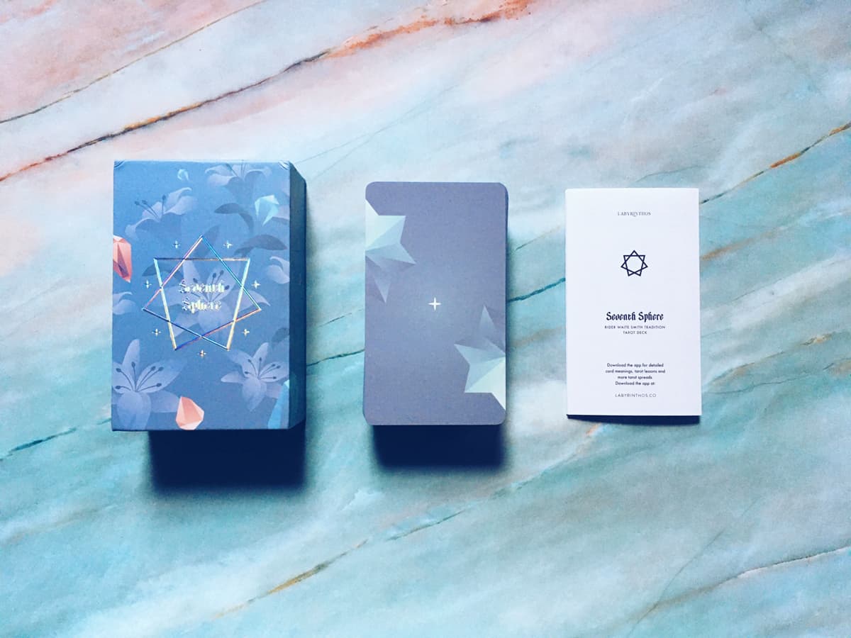 A Rider Waite Smith companion to the Seventh Sphere Marseille. Full bleed modern and calming illustrations, alongside blue holographic foil details and edges.